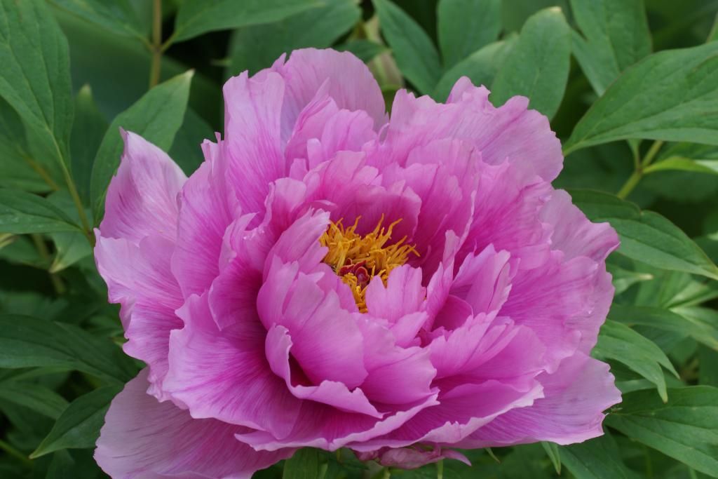 Пион древовидный "As pretty as flower and jade" станет изысканным украшением вашего сада благодаря своему романтичному цветению. Его нежные махровые лепестки, окрашенные в розовый перламутр, образуют пышные и плотные цветки, напоминающие хризантемы. Светло-розовые лепестки постепенно переходят в почти фиолетовый оттенок по мере приближения к яркой желтой сердцевине. Цветки этого сорта достигают внушительных размеров, до 30 см в диаметре, и особенно эффектно смотрятся на фоне насыщенной зелени листвы.